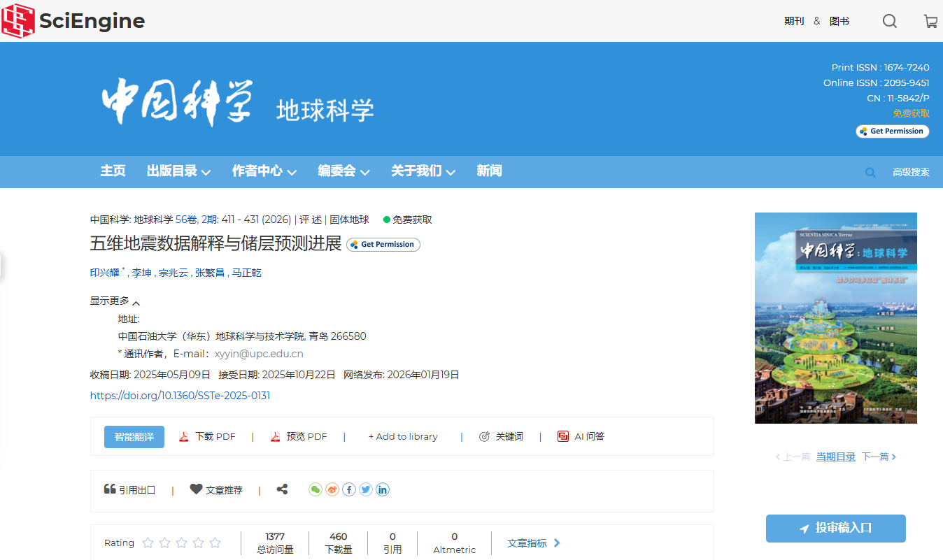 Yin X, Li K, Zong Z, Zhang F, Ma Z. 2026. Advances in five-dimensional seismic data interpretation and reservoir prediction. Science China Earth Sciences, 69(2): 395–415.
