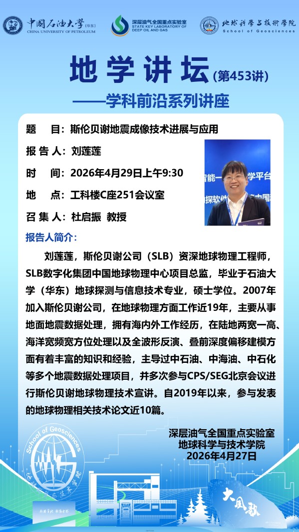【地学讲坛第453讲】关于刘莲莲资深地球物理工程师《斯伦贝谢地震成像技术进展与应用》学术报告的通知