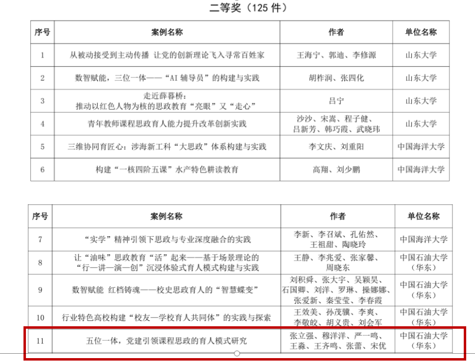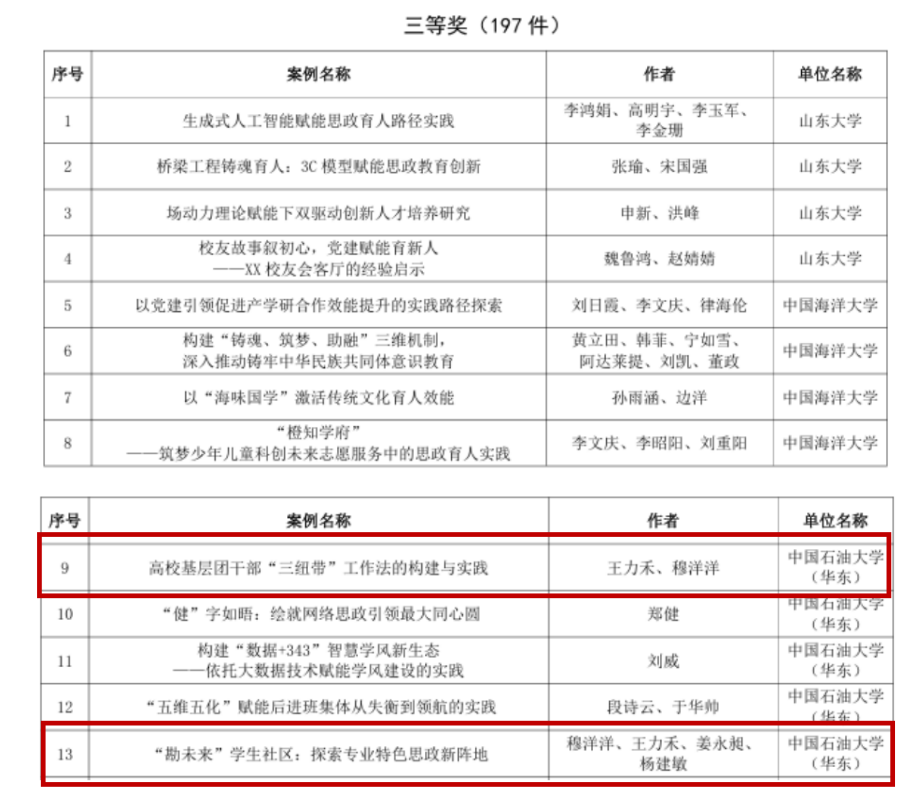 近日,2025年度山东省高等学校思想政治教育优秀论文和优秀工作案例揭晓,我院申报的三项案例全部获奖。其中《五位一体,党建引领课程思政的育人模式研究》获优秀工作案例二等奖,《高校基层团干部“三纽带”工作法的构建与实践》、《“勘未来”学生社区:探索专业特色思政新阵地》获秀工作案例三等奖。